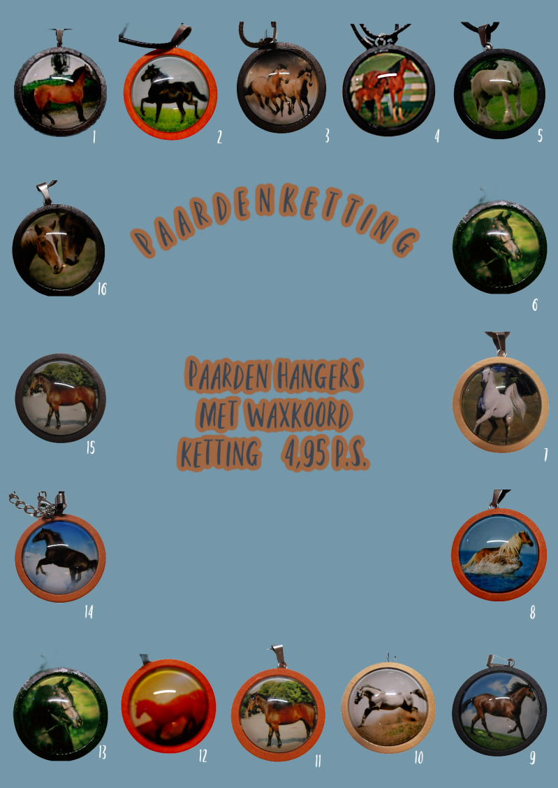 Paardenhangers van houten glas met waxkoord € 5.95 p.s. waxkoord in zwart, bruin en blauw